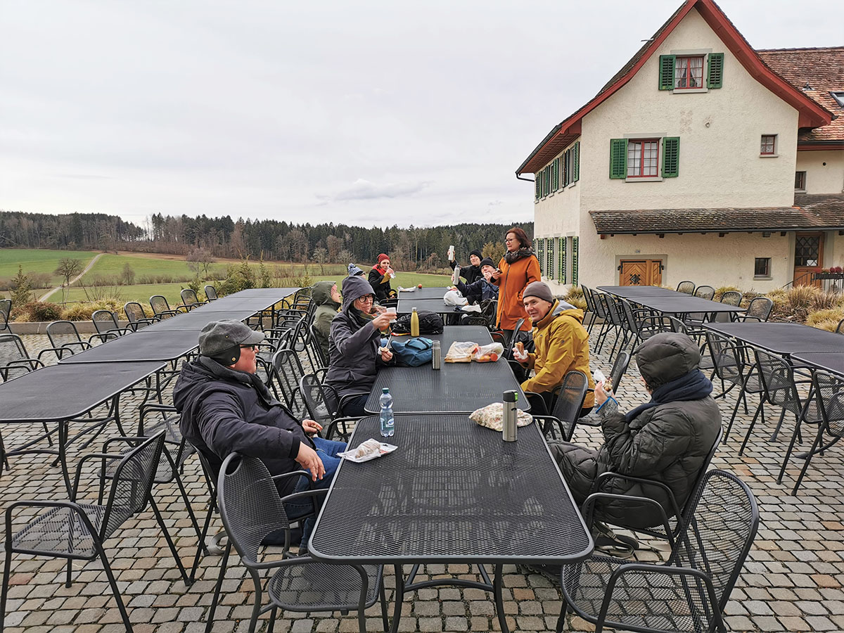Nach zwei Jahren Pandemie ist Wetter kein Thema mehr: Die Hauptsachenwanderer trotzen beim Picknick dem beissend kalten Westwind.