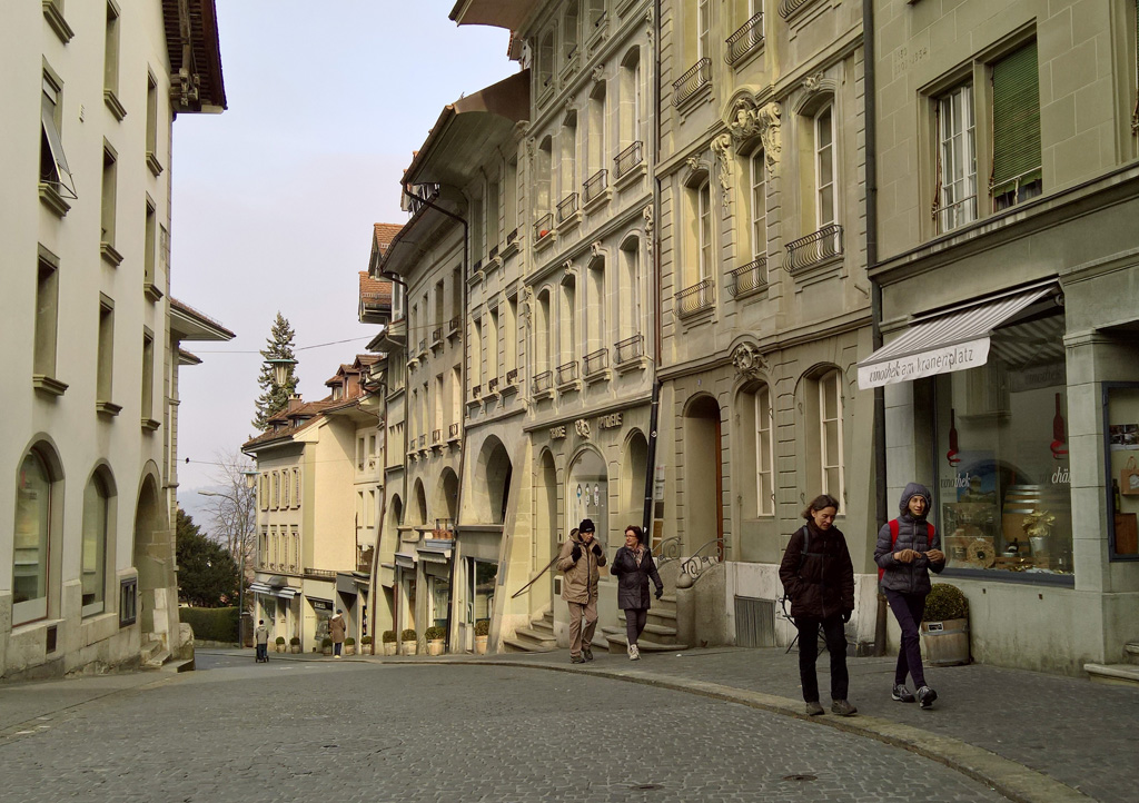Nachdem wir uns von diesem Pünktlichkeitsschreck erholt hatten, zogen wir los. Zum Auftakt pflügten wir an schrecklichster Agglo-Architektur vorbei. In den 1970er-Jahren müssen sich die beiden führenden Grossverteiler in Burgdorf einen erbitterten Kampf um das schweizweit entsetzlichste Einkaufslokal geliefert haben. Die Trümmer kann man noch heute besichtigen. Die Staffage besserte zum Glück rasch. Am Franz-Gertsch-Museum vorüber gelangten wir in die putzige Altstadt. Ein garstiger Winterwind verhalf Mänteln, Handschuhen und Mützen zu ehrenvollen Auftritten. Ana zog sich sogar ihre gefütterte Kapuze über den Kopf und stapfte wie ein Eskimo über das mittelalterliche Kopfsteinpflaster.