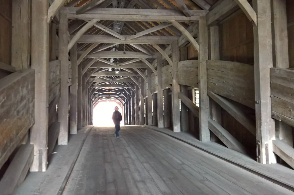 Während die einen also frohlockten und die anderen still die Natur genossen, gelangten wir zu einem Europarekord: Die gedeckte Holzbrücke von Hasle-Rüegsau gilt als grösste Holzbogenbrücke des Kontinents. Wir standen und staunten. Da vernahmen wir Hufgeklapper. Stilgerecht überquerte eine anachronistische Person den anachronistischen Flussübergang: Reiterin auf Holzbrücke – vor meinem geistigen Auge begann das Grosse Alte Bern für einige Sekunden aufzuleben. Doch im nächsten Augenblick wurde ich jäh aus meiner Geschichtsträumerei gerissen: Im Zwielicht tauchte auf der anderen Seite der Brücke schemenhaft eine Gestalt auf, die wie ein Sheriff mit zwei Revolvern aussah. Doch zum Glück knallte es nicht – es war nur Cornelia, die schon mal am anderen Ufer hatte schnuppern wollen.