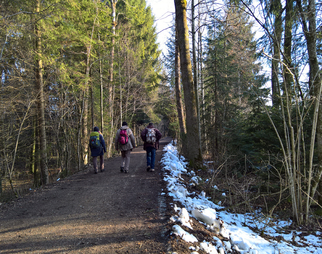 Als wir etwas später eine Brücke unterquerten, entdeckte Caroline einen höchst gravierenden Wanderweg-Markierungsmangel: Am Beton hing ein halb abgerissener gelber Rhomben-Kleber. Sie begann sich sogleich auszumalen, wie sie nun in ihrer Perplexität einen Notruf absetzen könnte, worauf dann sofort das Wanderweg-Care-Team per Helikopter einflöge und ihr die einzuschlagende Richtung zeigen würde. Mit vereinten Kräften konnten wir sie schliesslich davon überzeugen, dass wir die Route vermutlich auch so nicht verfehlen würden. Es war nämlich recht einfach: An vielen Stellen war der Wanderweg richtiggehend vergletschert. Wir brauchten also nur dem Glatteis zu folgen und kämen dann schon nach Zollbrück.