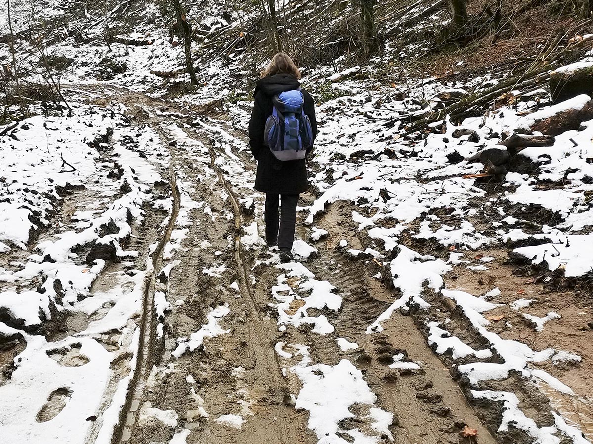 Auf verbotenen Wegen unterwegs: Wegen Holzereiarbeiten hatten sie diesen Weg gesperrt. Es war Sonntag, die Sägen ruhten und, psst, wir schlichen uns trotzdem durch.