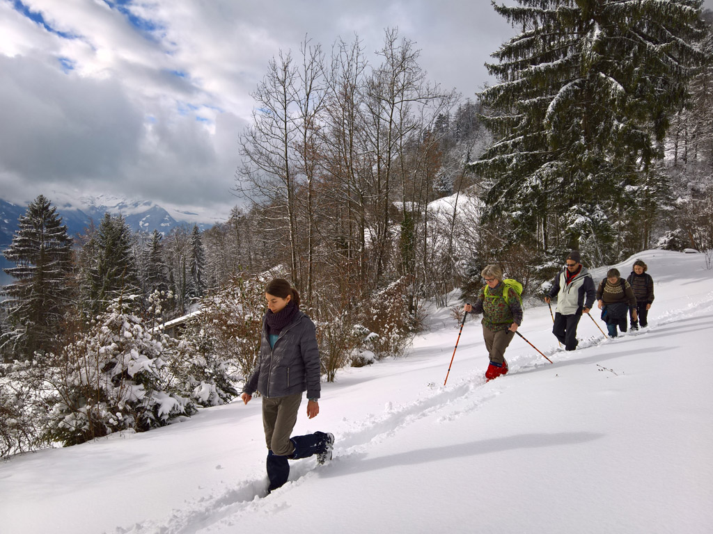 Nach der Mittagspause verzichteten wir auf den Abstecher hinauf zum Ausleitbauwerk des Glyssibachs. Das ist zwar ein recht spektakulärer Schauplatz, aber noch anziehender schien uns das verschneite Tälchen nahe des Weilers Glyssen. Wir pflügten durch die jungfräuliche Schneedecke einen Hang hinunter und durchquerten ein Wäldchen, das – man kann es nicht anders sagen – von gellender Stille durchdrungen war. Wir kamen uns vor wie ein astronautisches Expeditionskorps, das in ferner Einsamkeit die ersten Pionierschritte auf einem unerforschten Planeten unternimmt.