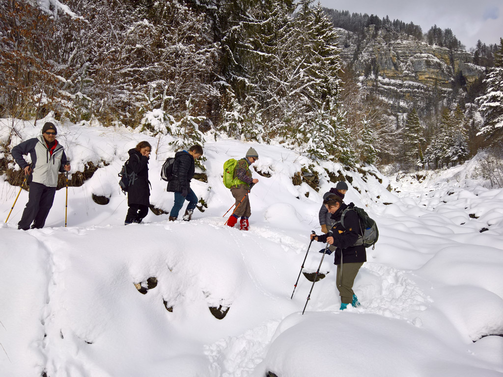Als wir an den Glyssibach kamen, wurde es tatsächlich recht abenteuerlich. Im Bachbett liegen eigentlich grosse Felsblöcke und Steinplatten, doch gegenwärtig war nichts als eine trügerisch weiche, weisse Federdecke zu sehen. Ich versuchte mir einen heldenhaften Anstrich zu geben, setzte mich an die Spitze des Wandertrupps und tastete mich durch das heimtückische Terrain voran. Schritt für Schritt ging es zwischen Steinen, brüchigen Eisplatten und hinterlistig blubberndem Wasser hindurch, wobei ich den Weg so zu wählen bestrebt war, dass auch die nachfolgenden Pioniere nicht in die kalten Fluten fielen. (Ehrlicherweise müsste man eher von Flütchen sprechen, denn der Bach führte nur wenig Wasser. Weil dieses Wenige aber unangenehm kalt war, suchte man seine Bekanntschaft trotzdem nicht).