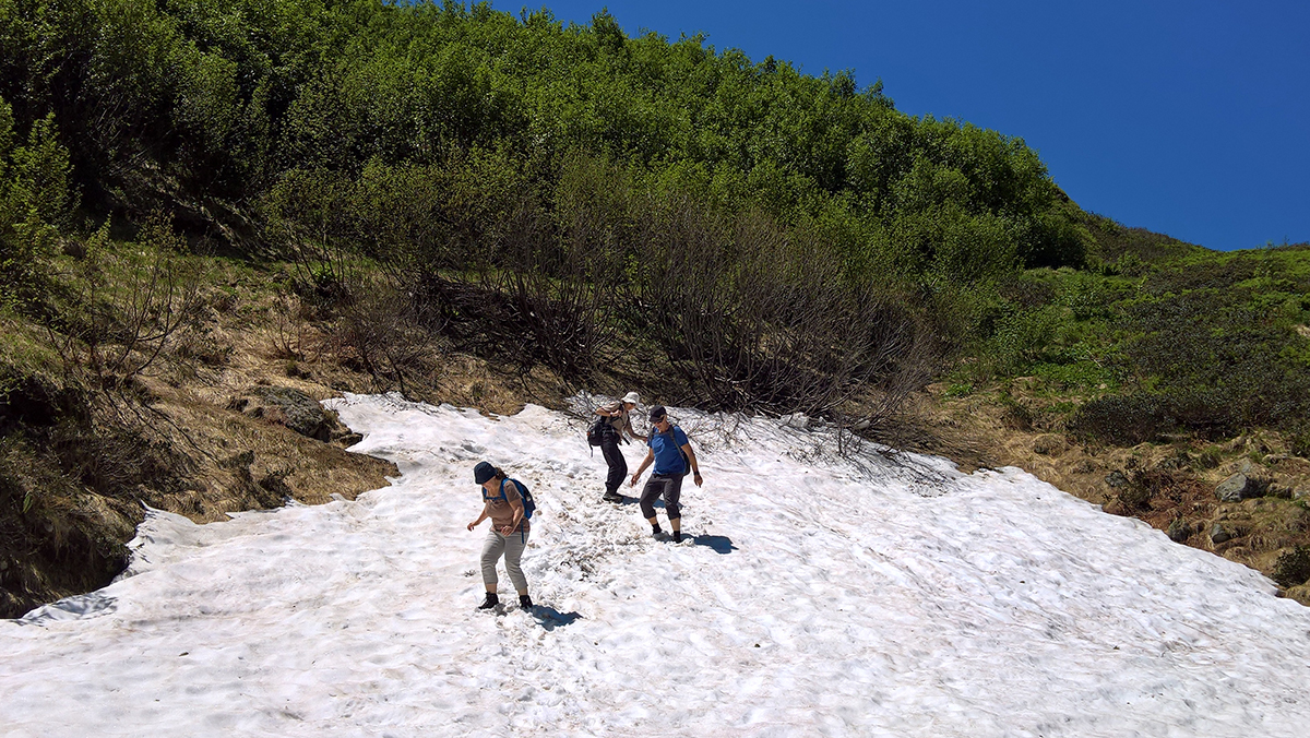 Während sich das Mittelland bei Temperaturen von 35 Grad in eine Friteuse verwandelte, erquickten sich die Aaronauten in Schnee und Gletscherwasser: Die Tour vom 30. Juni 2019 führte sie ins Einzugsgebiet des Gadmerwassers. Eiskalt fummelten sie am «Konzept» herum, indem sie sich gleich zum Einstieg eine Kaffeepause im Berghotel Steingletscher gönnten. Konsequenterweise liessen sie die Wanderung am Ziel in Gadmen mit kühlen Erfrischungsgetränken ausklingen.