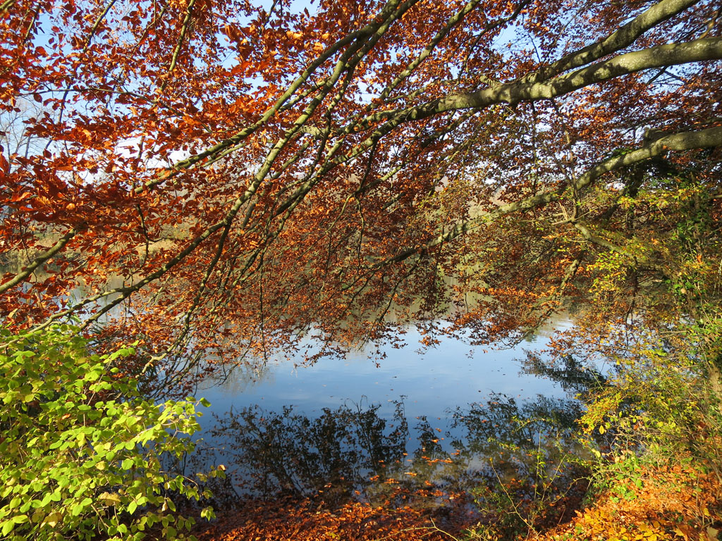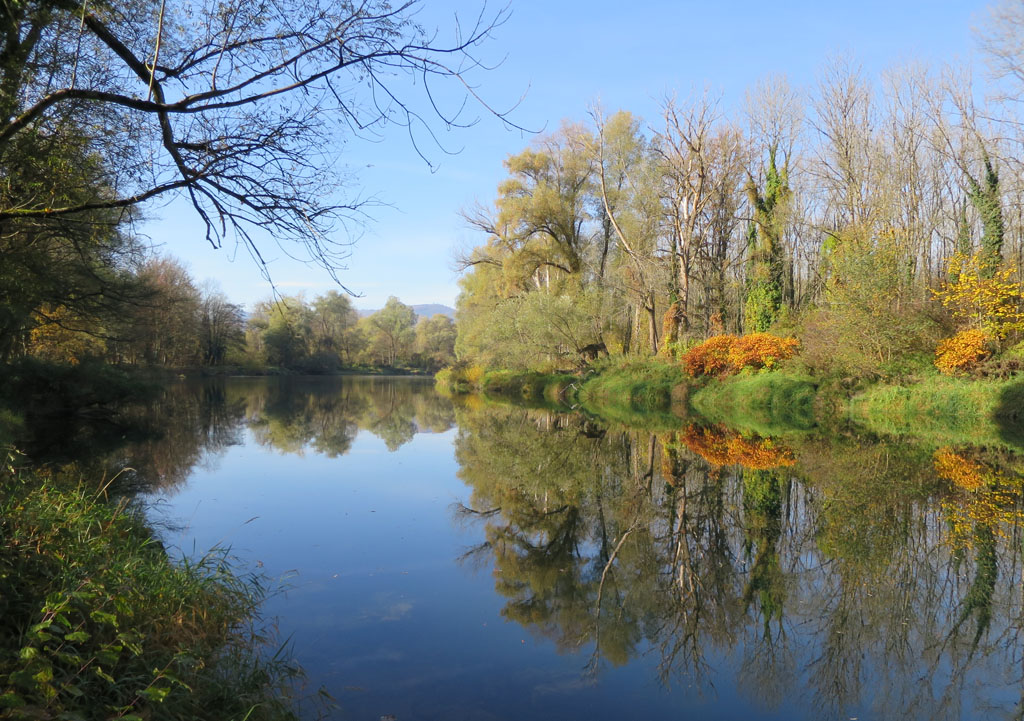 Die Sonne meinte es einmal mehr gut mit uns Aare-Wanderern. Verschwenderisch goss sie schon am Vormittag goldenes Herbstlicht über die Schinznacher Auenwälder. Insgeheim hatten wir, wie wir uns gegenseitig eingestanden, auf ein zartes Nebelschleierchen gehofft, das der Landschaft eine mystische Aura verliehe. Wohlgemerkt, Nebel natürlich nur in streng dosierter Form, also mit Auflösung spätestens am Mittag.