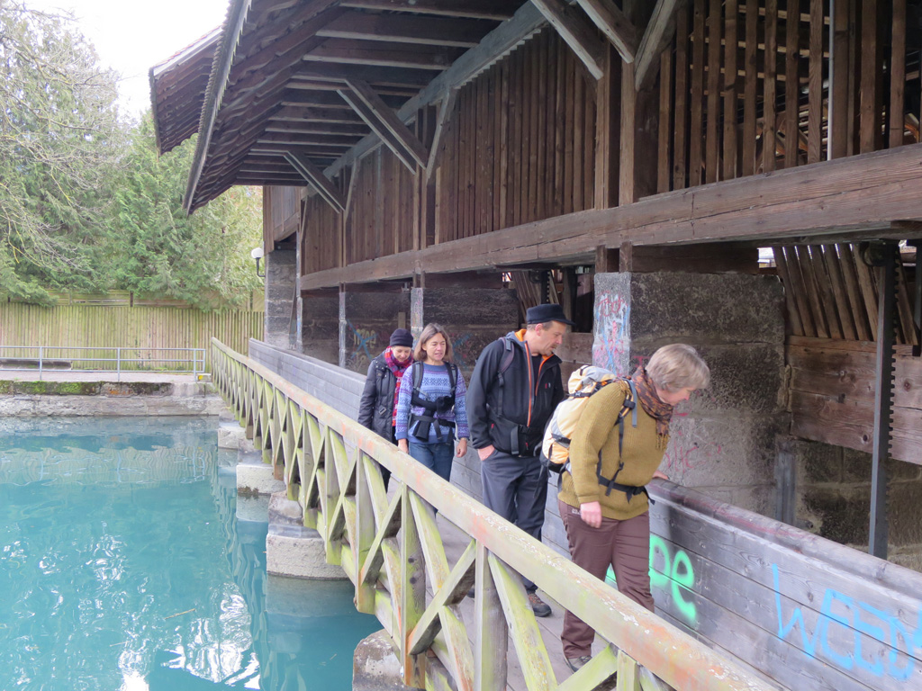 Unser Geplaudere über reformierte Heilige machte das nahezu Undenkbare möglich: Mitten in Unterseen mussten wir vor lauter Seitenarmen und Kanälen tatsächlich die Aare und unseren Weg suchen. Urs, der Kartograf, errettete uns mit einem raschen Blick auf eines seiner Werke vor dem endgültigen Irregehen.