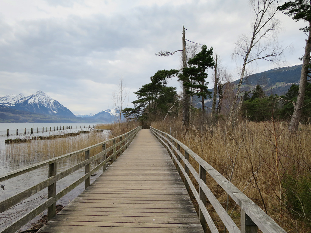 In diesem Sinne war das Aaronauten-Fünfergrüppli noch vollkommen ahnungslos, als es in Ringgenberg loszog. Gemäss Kalender herrschte bereits Winter, doch das Wetter gebärdete sich herbstlich mild. Brienzer- und Thunersee weisen an ihrem Nordufer Passagen auf, die eine landschaftliche Grandezza vermitteln und ein wenig an den Mittelmeerraum erinnern. So promenierten wir anfänglich also eher, als dass wir wanderten. Die Eisenbahnbrücke zwischen Goldswil und Interlaken überquerten wir nur, weil wir wollten, nicht weil wir mussten.