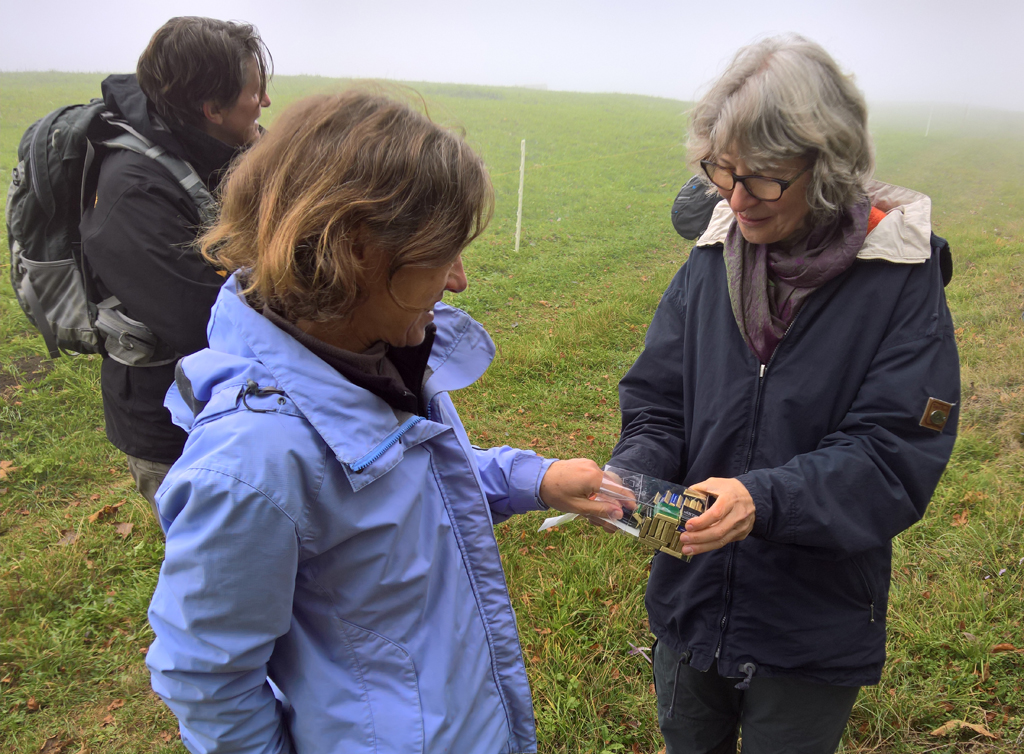 Danach ging’s in den Wald und aufwärts. Gleichmässig zog sich der schmale Pfad zwischen den dezent herbstlich gestimmten Bäumen dahin. Überall gab es Buchnüsse: Sie fielen mit zartem Plumpsen auf Steine und Äste, sie türmten sich im Laub, sie lagen auf dem Weg und knackten leise, wenn man darüber schritt. Wunderschön war dieser Aufstieg in einer von friedvoller Ruhe erfüllten Landschaft. Zwischendurch fiel mir auf, wie still auch wir selbst waren. Man könnte sagen, dass meine Begleiterinnen sich Männergesprächen hingaben (mit dieser Feststellung sei das Gender-Thema hiermit abgeschlossen).