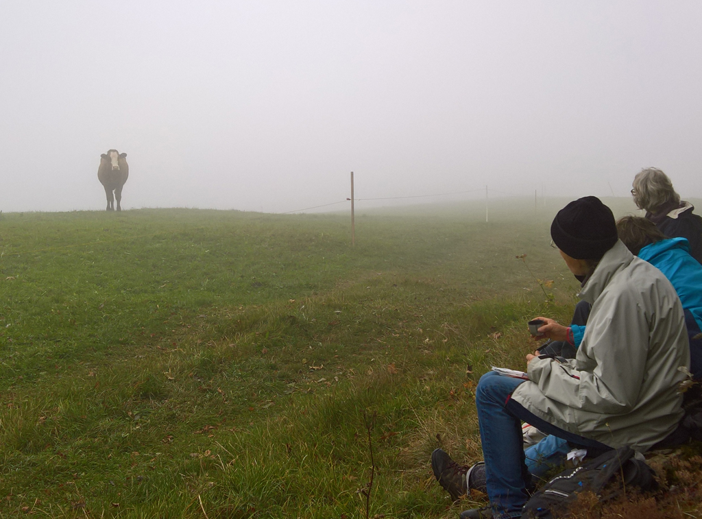Unseren Imbiss hielten wir am Rand einer grossen Weide ab. Massige Kühe schoben sich durch den Nebel. Eine davon entbrannte in regem Interesse an uns, kam herbei und guckte uns lange und intensiv an, wie wenn wir Meisterwerke an einer Museumswand wären. Als sie mit ihrem Studium fertig war, drehte sie uns ihr rückwärtiges Gesicht zu und erleichterte sich.