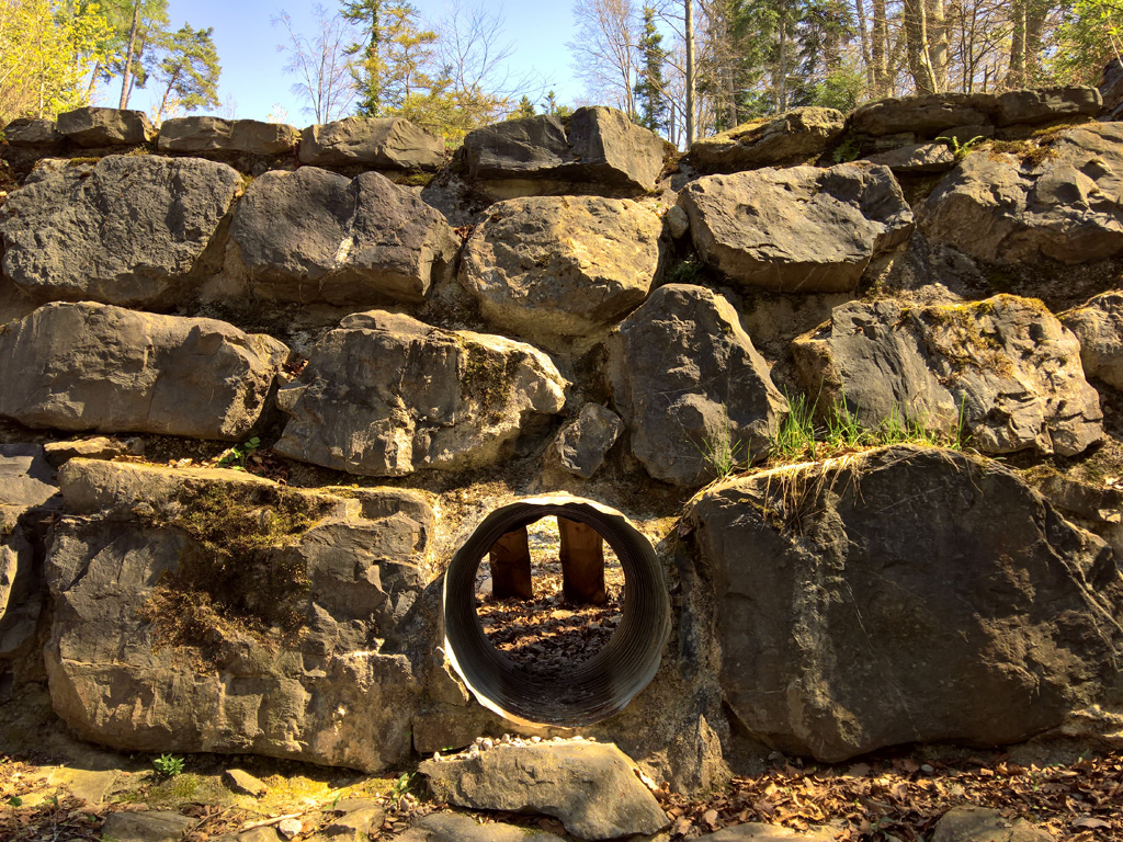 Besonders ausgemergelt war der Louelibach: Einzig massive Dämme verrieten, dass durch die trockene Steinwüste zuweilen tatsächlich Wasser fliesst. Dem offenbar höchst launischen Wildbach hatte man ein eigenwilliges Korsett verpasst: Quer im Bachbett stand eine hohe Mauer, an deren unterem Ende ein Metallrohr eingelassen war. Als wir hindurchguckten, sahen wir dahinter zwei monströse Pfosten, die wie Beine eines Riesen aussahen. Wie es hier wohl zu und her geht, wenn die Wasserfluten grosse Felsblöcke an die Sperre schieben? Man möchte eher nicht in der Nähe sein…