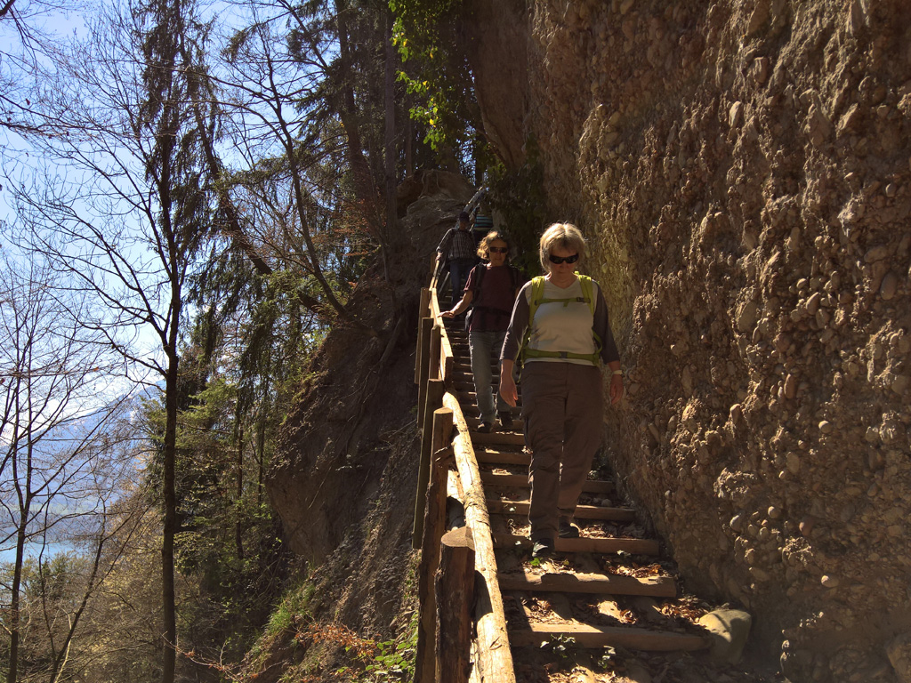 Die nächste Warnung ignorierten wir erneut frohgemut: «Bei Schneeschmelze im Frühling und bei Regenwetter ist das Überschreiten der Wildbäche erschwert oder gar unmöglich.» Der nahe Riderbach erwies sich als eher kümmerliches Wässerchen. Neckischerweise gab es an der Stelle, wo er sich in einen Wasserfall verwandelt, weder Tafeln noch Geländer. Dabei kann man sich dort auf recht elegante und extrem unkomplizierte Weise 30 m senkrecht in die Tiefe stürzen: Es genügt, wenn man an die Geländekante tritt und dann noch ein Schrittchen weiter geht. Evi kriegte jedenfalls sichtlich weiche Knie, als sie ihren tapferen (bzw. leichtsinnigen) Wandergenossinnen und –genossen beim Auskosten der Tiefblicke zuschaute.