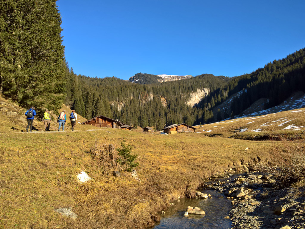 Wir marschierten anfänglich mehrere Kilometer auf Alpsträsschen. Zum Glück war das nur zum Auftakt, wo die Knochen jeweils noch frisch und munter sind. Es ging leicht bergauf. Der Skilift im Dorf stand etwas verloren auf der noch immer grünen Wiese. Beschneiung ist dort kein Thema. Dafür werden die Pisten ausgiebig begüllt (so roch es jedenfalls); vielleicht wächst dann ja auch der Schnee besser.
