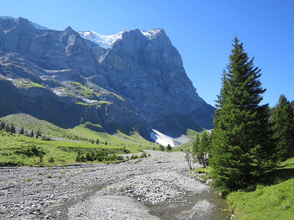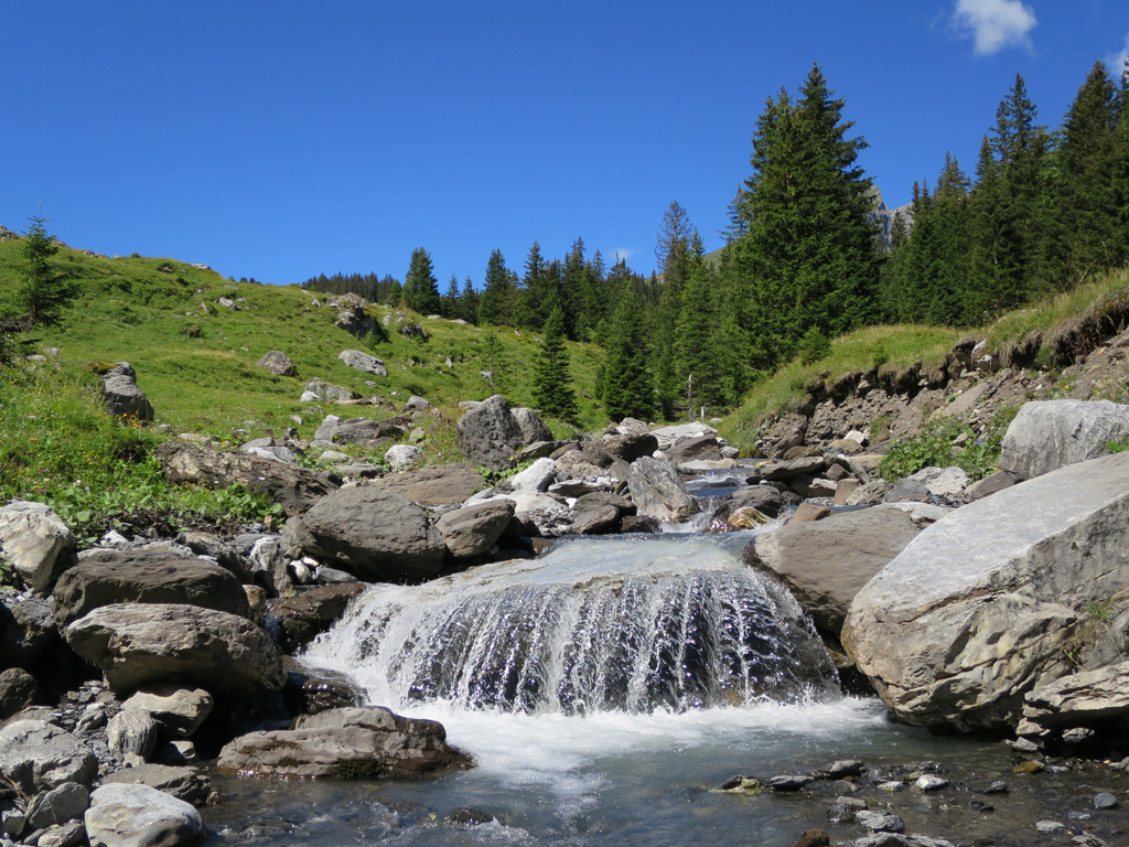 Das idyllischste Plätzchen des Tages erreichten wir schon nach gut einer Stunde: Am weiten, gerölligen Bachbett des jungen Reichenbachs hätte man sich im Schatten einer jungen Tanne ohne weiteres für Stunden niederlassen können, um die grandiose Hochgebirgswelt zu bestaunen und dem Plätschern des Wassers zu lauschen. Wir aber wollten wandern und liessen das Paradieslein schnöde beiseite. Auch auf Einkehrmöglichkeiten verzichteten wir traditions- bzw. konzeptgemäss. Stattdessen rasteten wir auf der Schwarzwaldalp direkt am tosenden Bach.