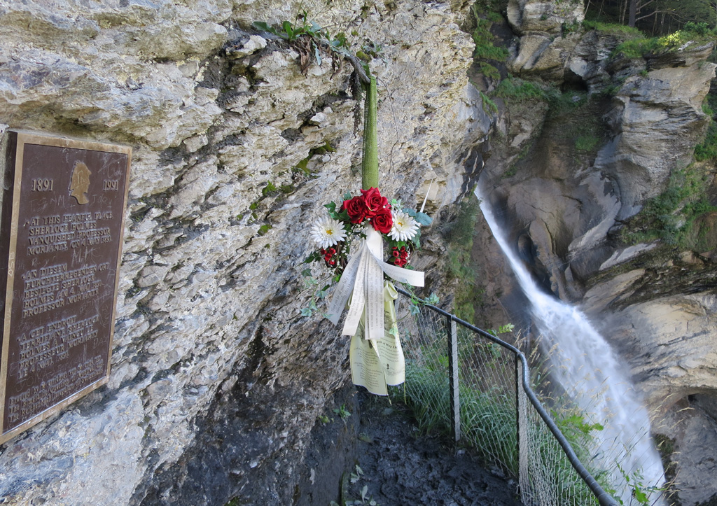 Unmittelbar neben der «Absturzstelle» ist eine Gedenktafel zu Ehren von Sherlock Holmes angebracht, die eine einigermassen skurrile Signatur trägt: Gestiftet wurde sie nämlich von «The Bimetallic Question of Montreal and The Reichenbach Irregulars of Switzerland». Man möchte solche Typen eigentlich ganz gerne kennenlernen.