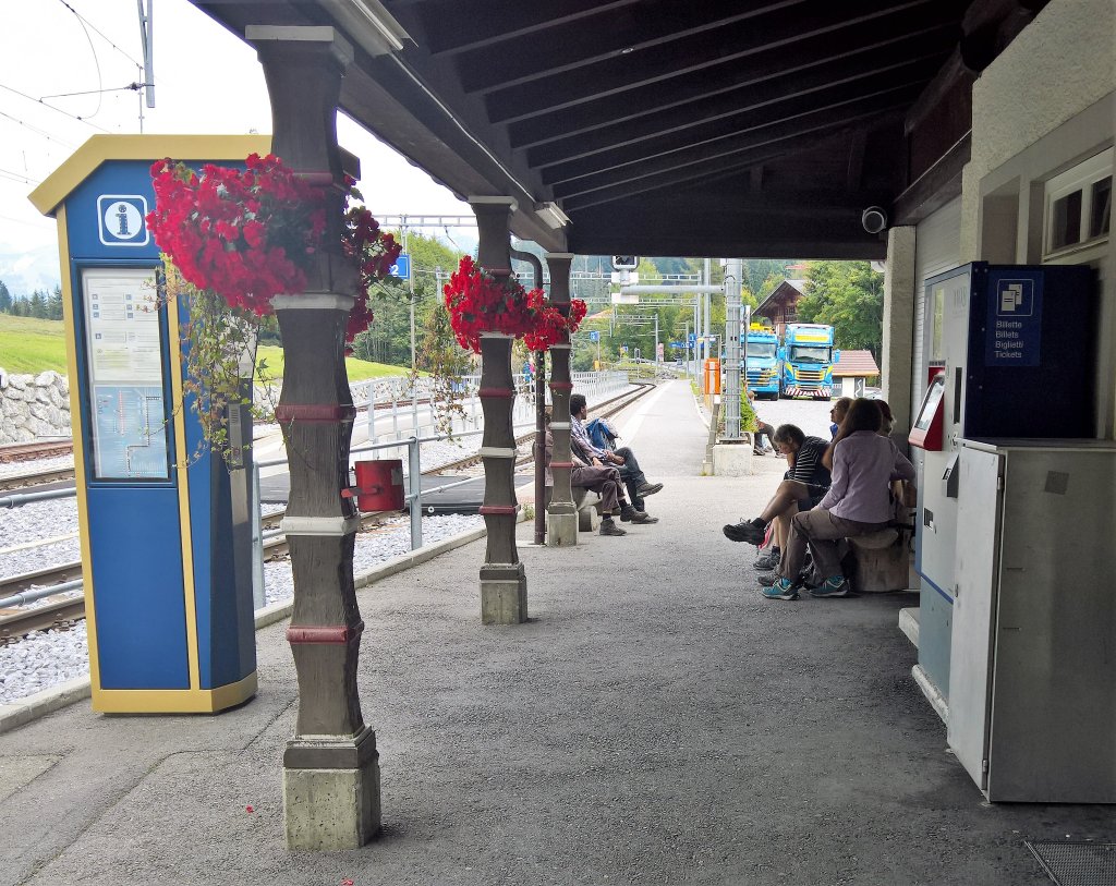 Weil kein exakter Marschplan existierte, kam das Aaronauten-Expeditionskorps in den Genuss von fünfzig Minuten Bahnhof Saanenmöser. Es hat dort nicht viel. Ein Käsekessi aus Kupfer, das als Brunnen dient (in Betrieb), einen Laden mit der Aufschrift «7 Tage offen» (geschlossen), davor eine Tiefkühltruhe mit bombastischem Sortiment (ebenfalls verriegelt), einen Selecta-Automaten. Wir sassen also da und schauten die Fahrleitung an.