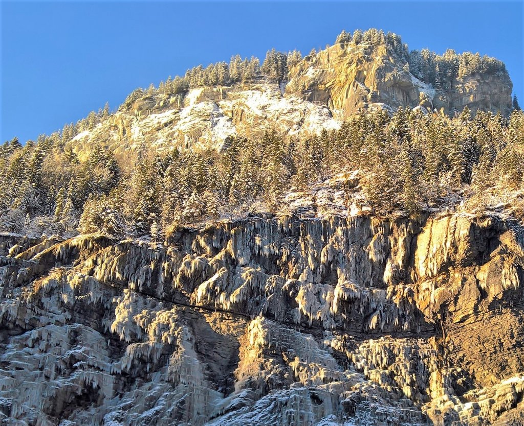 Schnellen Schrittes zogen wir los. Oben an der Fluh glänzten spektakuläre Eiszapfenformationen im Licht der Vormittagssonne. Unten im Tal herrschte noch immer Schatten, und das würde sich angesichts des engen und tiefen Geländeeinschnitts zweifellos erst in Stunden ändern. Ja, ich weiss und höre es immer wieder: Lauterbrunnen sei ein fürchterliches Schattenloch.