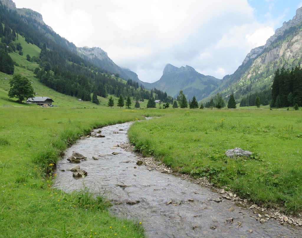 Den Grönbach selbst, der sowohl Anlass und Motiv als auch Begleitobjekt bzw. Ziel unserer Wanderung war, nahmen wir anfänglich nur am Rande wahr, denn wir plagten uns arg ab mit dem vielen Hartbelag, mit dem die Älpler den Talweg zugepflastert haben. Zunächst zeigte sich das Gewässer als recht unscheinbares Bächlein. Später nahm es nach und nach an Volumen und Lautstärke zu. Beim Püfel gab es ein idyllisches Plätzchen gleich am Ufer, mit Picknicktischen, Bänken, Grillstelle und seichten Abschnitten, die zum Planschen einluden. Doch ein Schild wies warnend darauf hin, hier liege ein Privatgrundstück vor. Wir fühlten uns sehr unwillkommen und zottelten gehorsam weiter.