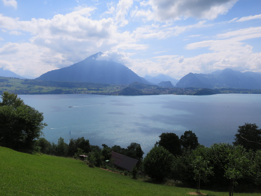 Es ging tüchtig steil abwärts, und mit jedem Schritt stieg die Temperatur minim, aber summa summarum deutlich fühlbar. Endlich erreichten wir den See, wo wir uns augenblicklich ein nettes Badeplätzchen suchen wollten. Dabei schlugen wir allerdings vermutlich die falsche Richtung ein und strandeten bald einmal im Niemandsland zwischen Kläranlage und Bootshafen. Nach einer Wanderung durch eine dermassen schöne Landschaft sei dies der perfekte Ort für einen Schwumm, fand Stefan. In dieser Sichtweise hatten wir unterwegs einen Überschuss an liebreizenden Eindrücken akkumuliert, den es jetzt dringend auszugleichen galt, damit die Welt im Lot blieb. Wir schwammen an einer Art Öltanker vorbei und erfreuten uns an der erfrischenden Kühle des Thunersees.