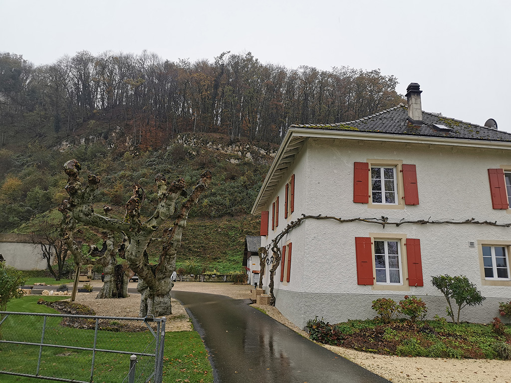 Mit dieser Erkenntnis in unseren Herzen stiegen wir von der Kuppe des Mormont ins Tal der Venoge ab. Zunächst galt es, den Grand Canyon von Eclépens zu umrunden. Der Kalkberg ist schon halb ausgehöhlt, das nahe Zementwerk wird ihn eines Tages wohl komplett verdaut haben. Als letztes Drittel der Tour wäre eigentlich eine Uferwanderung nach Penthalaz geplant gewesen. Allmählich regenmüde geworden, verzichteten wir dezidiert und zweigten stattdessen nach La Sarraz ab. Den zweiten Teil der Venoge-Tour werden wir bei anderer Gelegenheit nachholen.