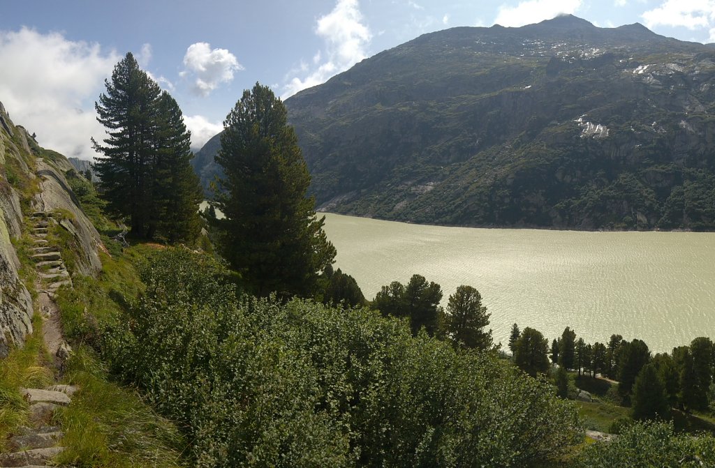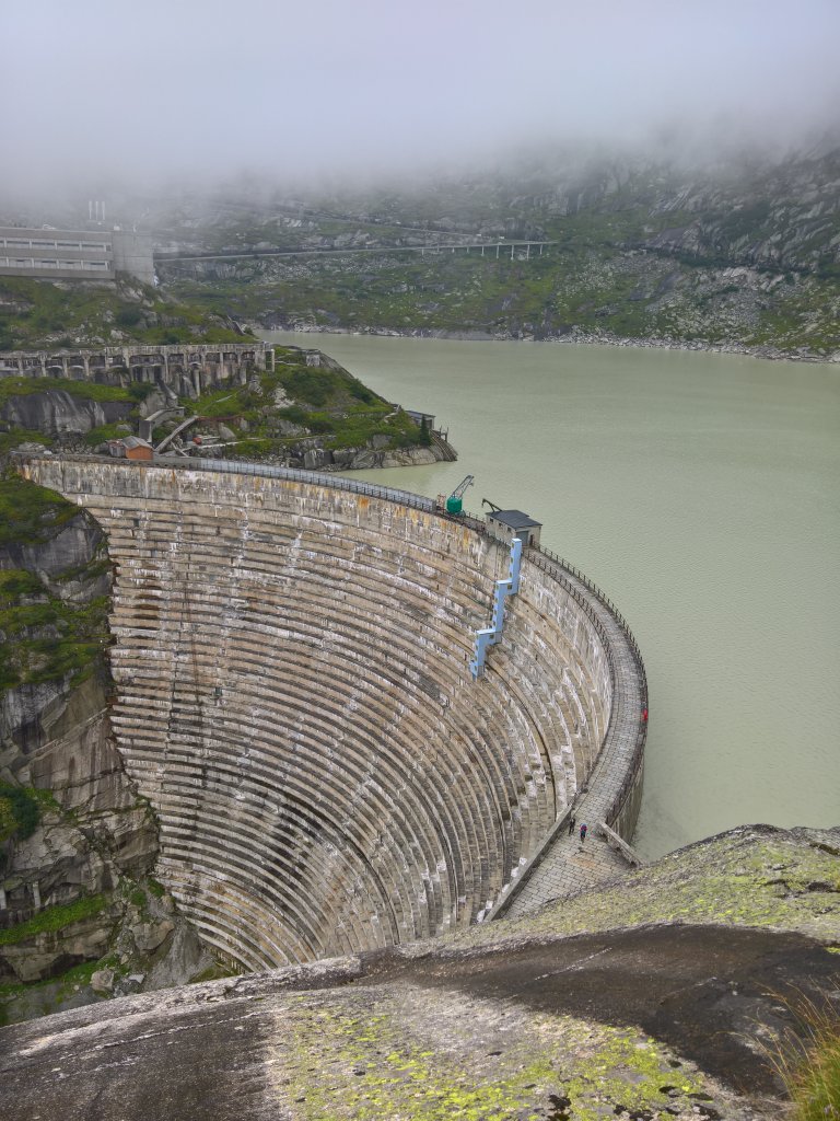 Speziell war der Wanderauftakt aber auch in landschaftlicher Hinsicht. Vom Hospiz, einem natürlich gewachsenen Felsnollen, ging es auf Metall- und Steintreppen zu einer gewaltigen Staumauer hinunter. 75 Millionen Tonnen Wasser drücken gegen das Bauwerk. Das ist etwa so, wie wenn man 200 Ausgaben des Empire State Buildings auf den Boden legen und gegen die Betonmauer schieben würde. Also nichts wie hinüber ans andere Ende des Riegels. Dort ging es auf ebenso künstlichem Trasse gleich wieder steil hoch und danach durch einen Tunnel (er ist unbeleuchtet und bei den Portalen hat es aufregend grosse, tiefe Pfützen).